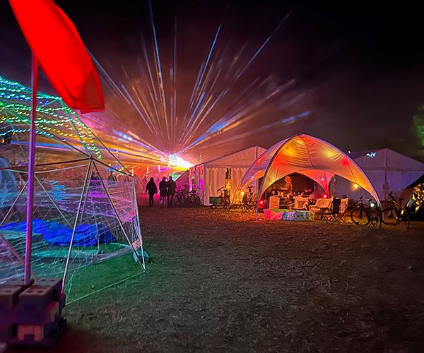 到了晚上,整个场地真正变得生动起来。村庄将黑暗视为一种个人侮辱,并在活动的几十年里不断增加 LED、聚光灯和激光的武器库。太阳落山时,活动现场充满了灯光秀,各个村落通过独特的音乐表演、音箱阵列和 DJ 演出增添了会议的热闹氛围。