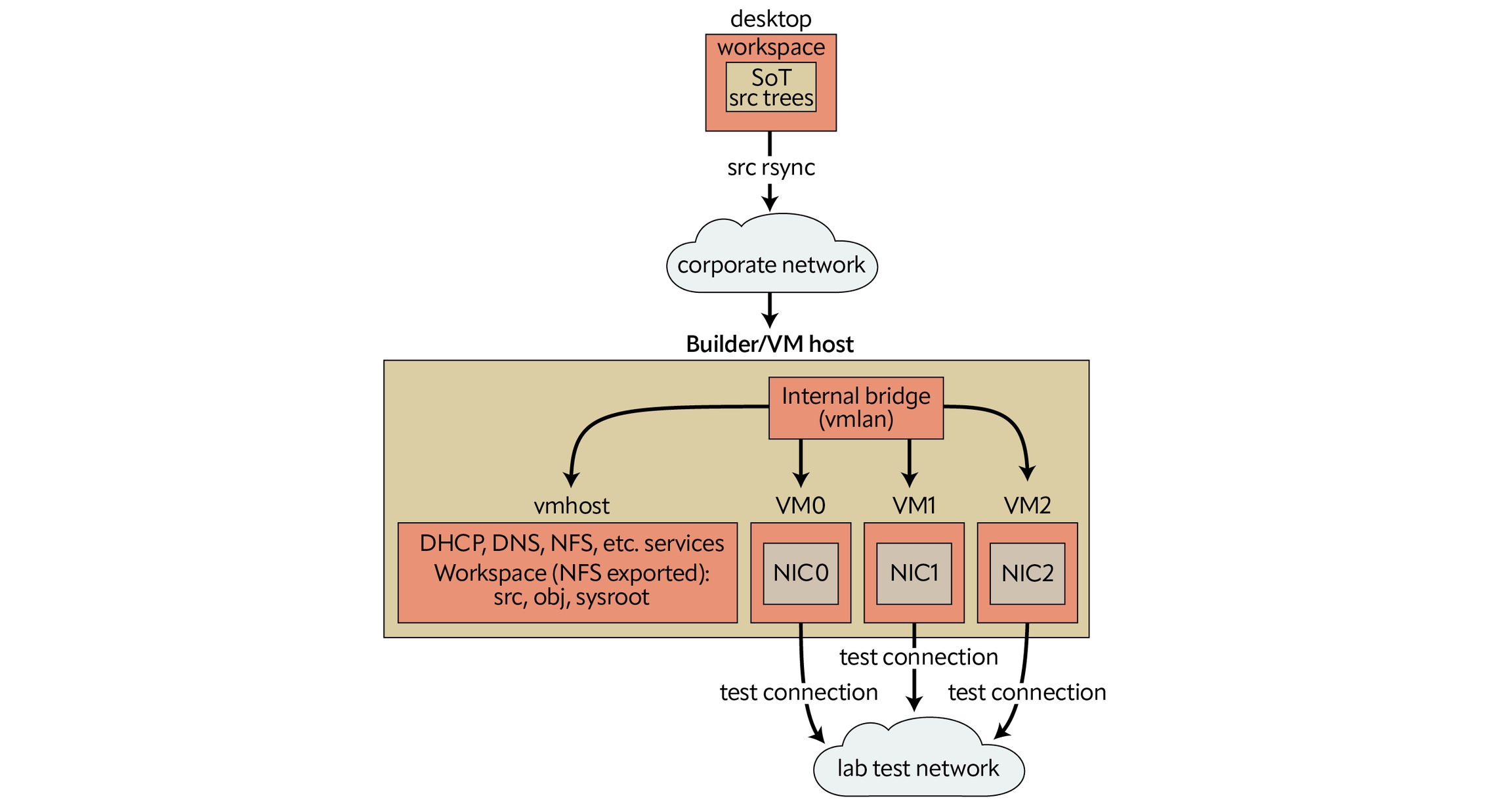 本文其余部分假设使用两台系统,并使用主机名“desktop”和“builder”来指代它们。源代码的主副本存储在 desktop 上,用户在此编辑并同步到 builder。接下来的操作都在 builder 上以 root 身份进行。builder 在其内部网络中也被称为“vmhost”。