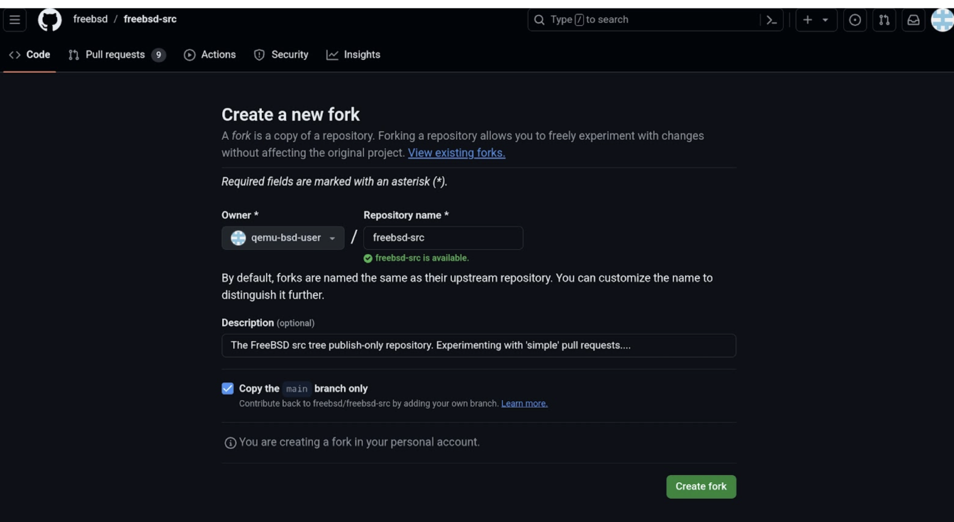想创建 PR 的用户会在他们的 freebsd-src 存储库的复刻上创建一个分支。