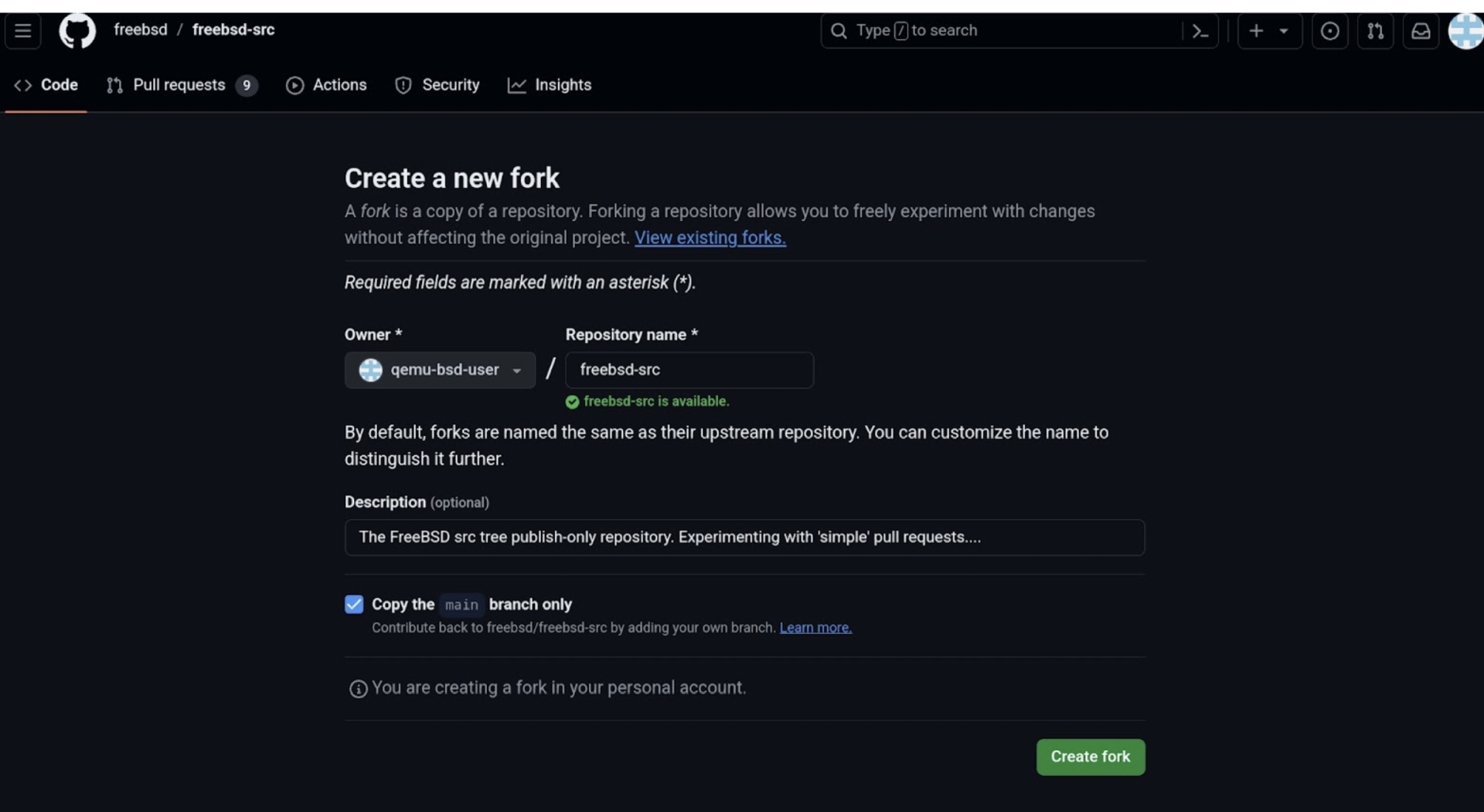 - 想创建 PR 的用户会在他们的 freebsd-src 存储库的复刻上创建一个分支。