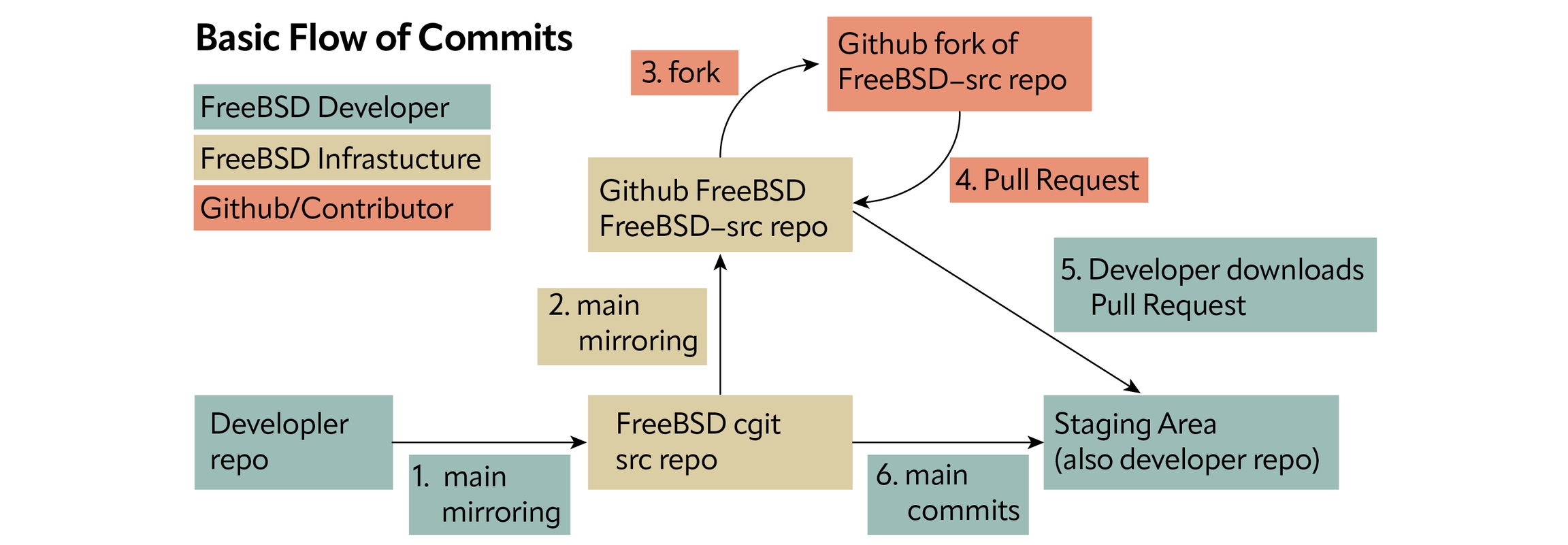- FreeBSD 开发者直接向 FreeBSD 存储库推送提交,该存储库托管在 <FreeBSD.org> 集群。