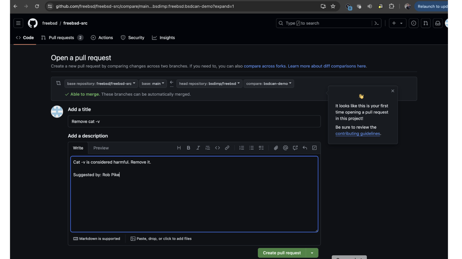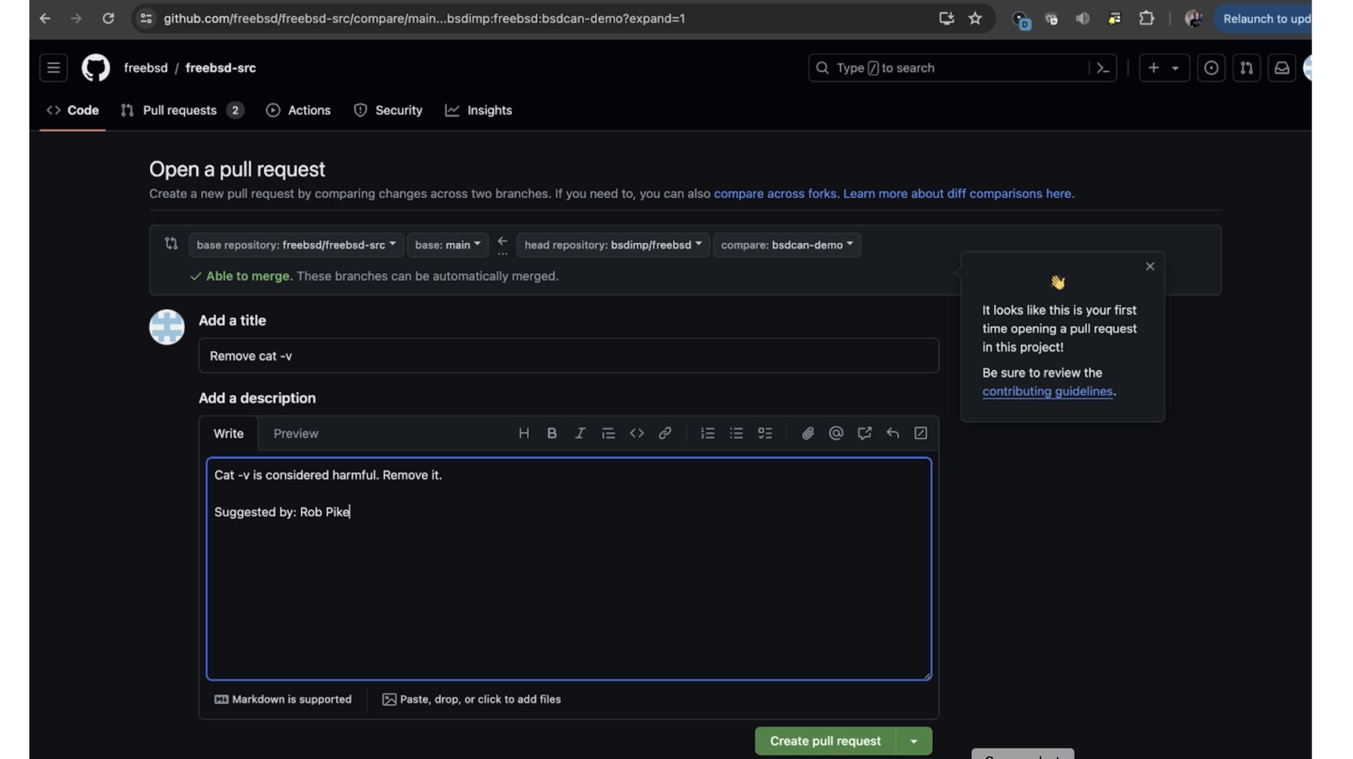 接下来,我将介绍:如何将你的提交切换为 Git 分支,如何完善它们以符合 FreeBSD 项目的标准和规范,如何从你的分支创建 PR,以及对审查流程的预估。然后,我将为志愿者说明如何评估 PR,并提供完善 PR 的技巧。