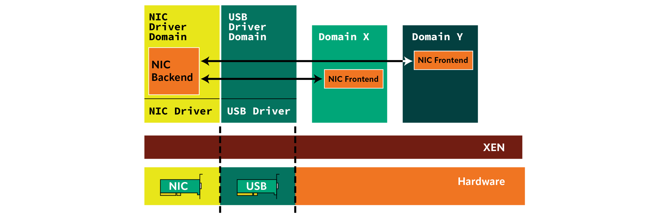 驱动程序域:网络卡和 USB 驱动程序运行在单独的虚拟机中,从而避免了这些设备的安全问题危及整个系统。请参见关于驱动程序域的图示。